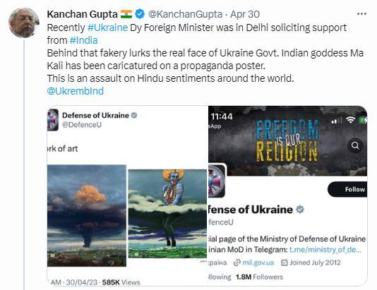 據(jù)俄新社報道,印度信息和廣播部高級顧問古普塔也對此表達(dá)了強烈的不滿,他在推特上轉(zhuǎn)發(fā)這一截圖,并寫道,“最近烏克蘭副外長曾在新德里請求印度支持。這張偽造圖背后隱藏著烏克蘭政府的真實面目。印度教女神卡莉被諷刺地畫在一張宣傳海報上。這是對全世界印度教徒感情的攻擊”。