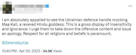 《印度斯坦時報》稱,這張圖被認(rèn)為丑化了印度教女神,是“對印度教的不尊重”,推文“遭到強烈反對”“傷害了印度人的感情”。甚至有印度網(wǎng)友呼吁印度官方干預(yù)此事。目前,烏克蘭國防部已經(jīng)刪除該推文。