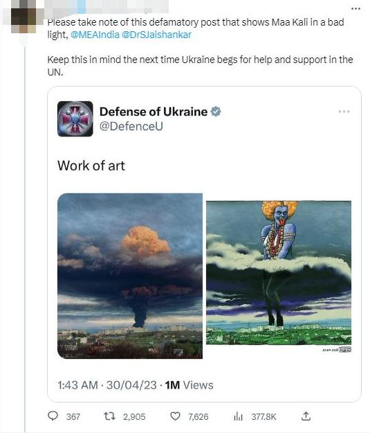 有推特網(wǎng)友@印度外交部和外長蘇杰生“請注意這篇詆毀女神卡莉的誹謗帖子。下次烏克蘭在聯(lián)合國尋求幫助和支持時,請記住這一點。”