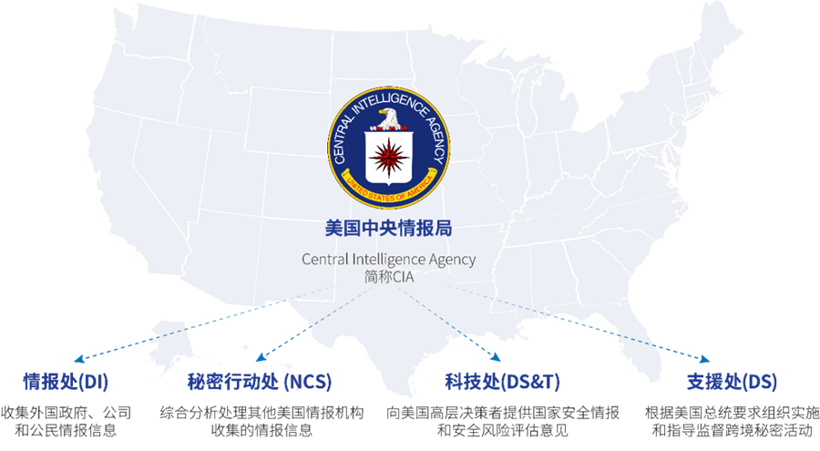 CIA是美國聯邦政府主要情報機構之一,總部位于美國弗吉尼亞州蘭利,下設情報處(DI)、秘密行動處(NCS)、科技處(DS&T)、支援處(DS)四個部門。其主要業務范圍涉及:收集外國政府、公司和公民情報信息;綜合分析處理其他美國情報機構收集的情報信息;向美國高層決策者提供國家安全情報和安全風險評估意見;根據美國總統要求組織實施和指導監督跨境秘密活動等。