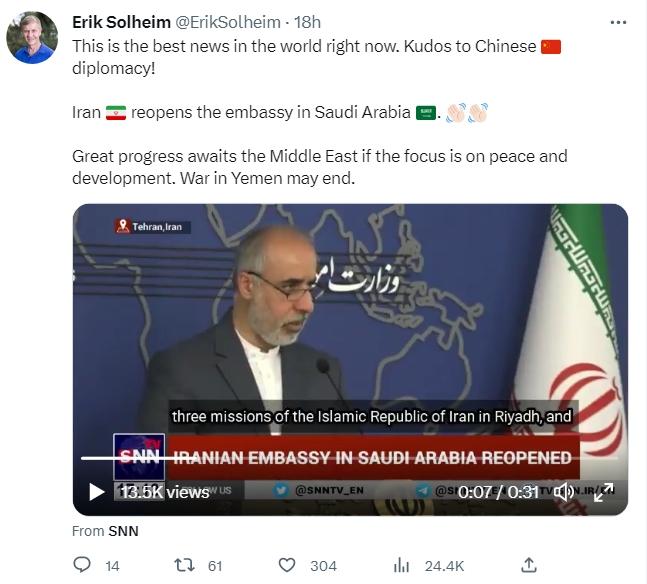 索爾海姆配文提到“伊朗重新開(kāi)放駐沙特阿拉伯大使館”。他表示,“這是目前世界上最好的消息。為中國(guó)外交點(diǎn)贊!”