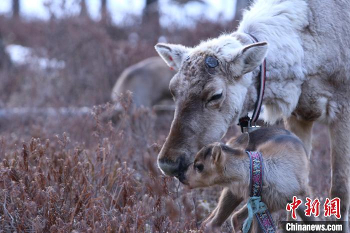 4月中旬至5月下旬是馴鹿集中產仔季,馴鹿媽媽與鹿寶寶親密互動。(根河市融媒體中心供圖)