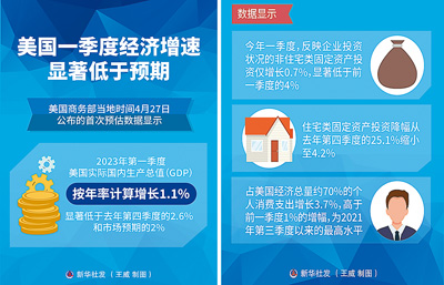 近日,美國商務部經濟分析局數據顯示,美國2023年一季度GDP年化環比增長1.1%,大幅低于市場預期的2%,較去年四季度2.6%的增幅有所回落,已連續兩個季度放緩。《華爾街日報》網站報道稱,在通貨膨脹仍然高企、利率不斷上升的情況下,美國第一季度經濟增長下滑,增加了人們對今年晚些時候可能出現經濟衰退的擔憂。
