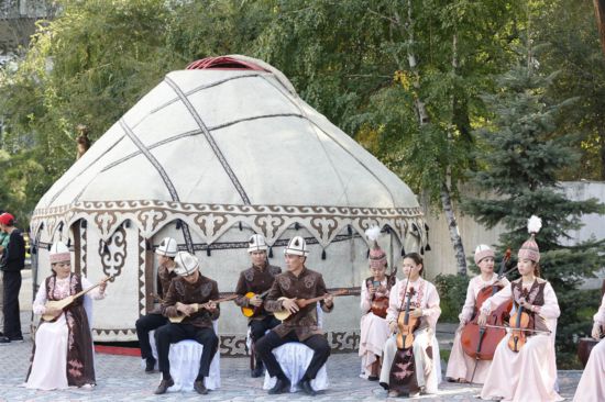 ↑身穿民族服飾的演奏者在吉爾吉斯斯坦首都比什凱克用傳統(tǒng)樂器合奏音樂。