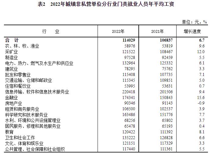 2022年城鎮非私營單位分行業門類就業人員年平均工資。來自國家統計局網站