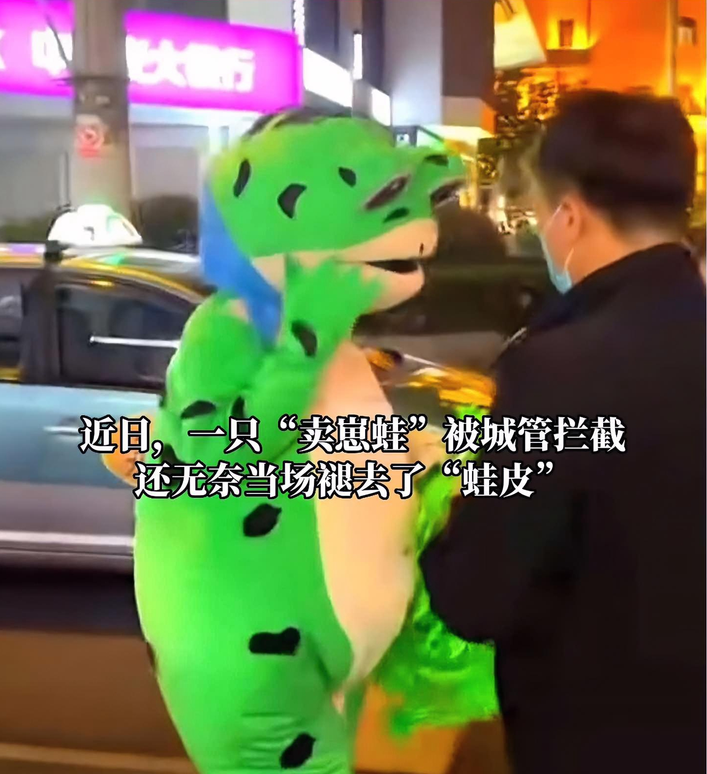 最近,“網紅賣崽青蛙上海落網”在網上引起熱議。在上海街頭,一只“賣崽青蛙”被城管攔截,還無奈當場褪去了“蛙皮”。