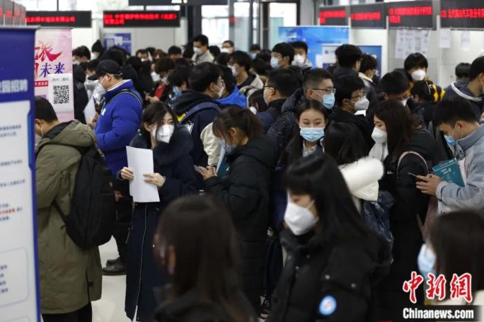2023年2月8日,北京市教委所屬北京高校大學生就業創業指導中心迎來春季首場線下雙選會,應聘者排隊等候向用人單位提交個人簡歷。富田 攝
