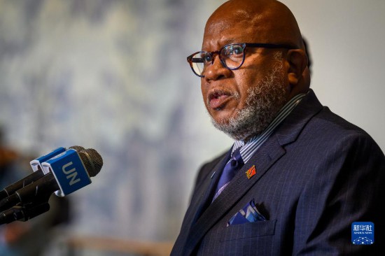 6月1日,在位于紐約的聯合國總部,特立尼達和多巴哥常駐聯合國代表丹尼斯·弗朗西斯當選第78屆聯合國大會主席后向記者發表談話。新華社發(聯合國供圖/洛伊·費利普攝)