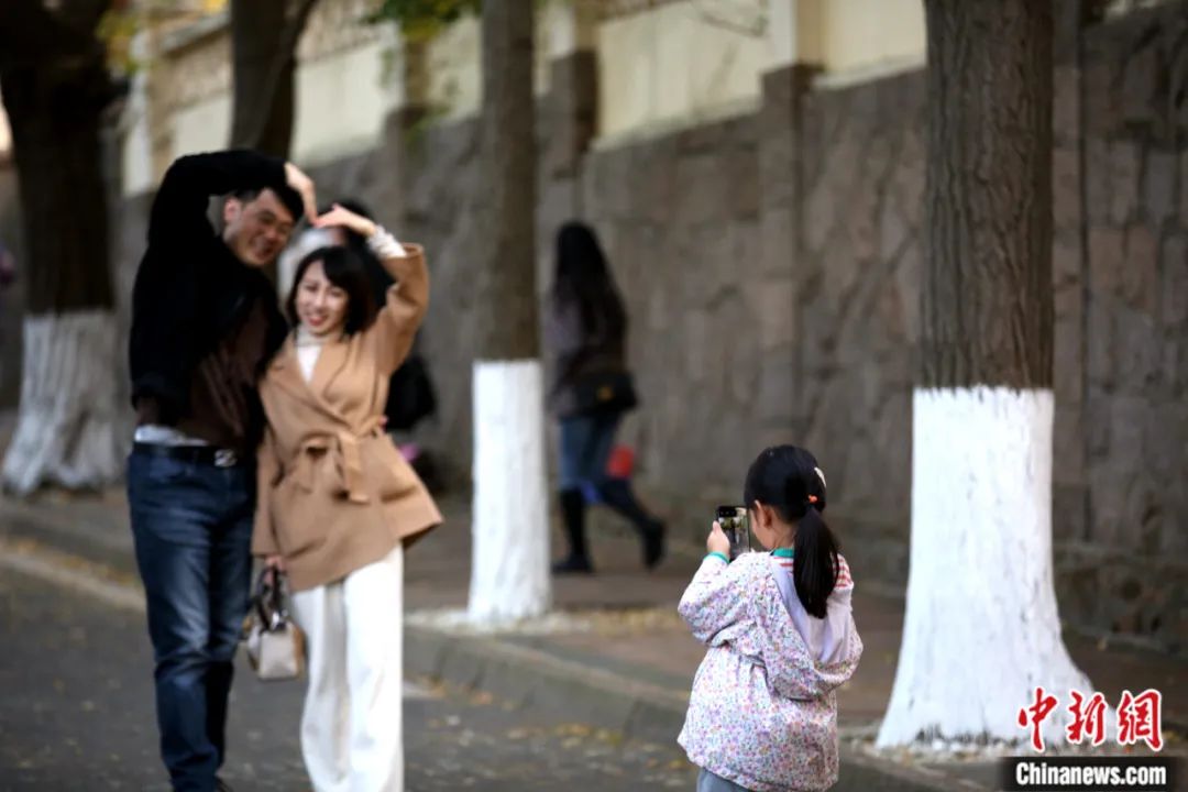 2022年11月,山東省青島市八大關景區居庸關路,一名兒童為父母拍照留念。蔡亞群 攝