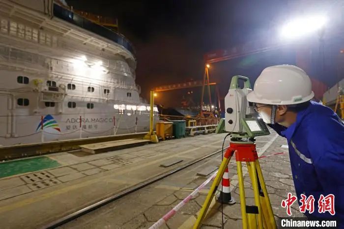 6月1日凌晨2時,中國首艘國產(chǎn)大型郵輪“愛達·魔都號”開始注水起浮,工作人員對船體相關數(shù)據(jù)進行檢測。殷立勤 攝