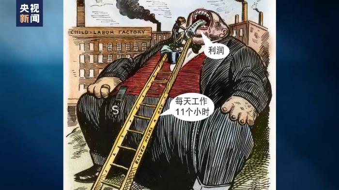 在這張漫畫中,一名瘦削的童工一天工作11個小時,將利潤送進貪婪的雇主口中,將他們養得腦滿腸肥。