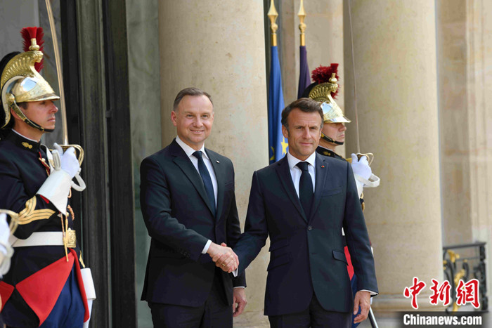 當地時間6月12日晚,法國總統馬克龍在巴黎愛麗舍宮會見波蘭總統杜達。杜達前來出席當天舉行的法德波三國領導人會談。 中新社記者 李洋 攝
