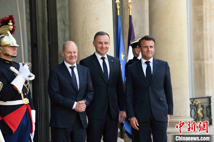 當地時間6月12日晚,法國總統馬克龍在巴黎愛麗舍宮與德國總理朔爾茨、波蘭總統杜達會面。他們共同出席“魏瑪三角”機制下的三國領導人會議。 中新社記者 李洋 攝