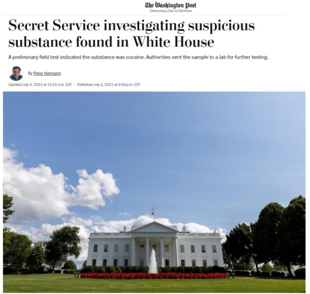 中新網7月4日電 據美國《華盛頓郵報》4日報道,當地時間2日晚,美國特勤局在白宮內發現了一些可疑白色粉末狀物質,經初步鑒定,其中含有可卡因成分。