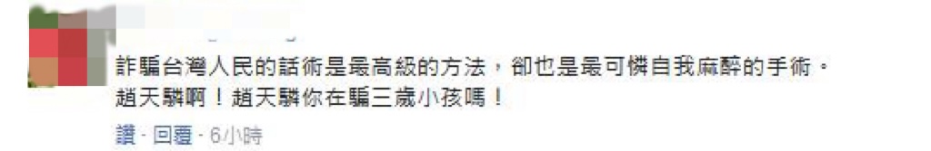 也有臺灣網友評論表示“果然是綠色邏輯思維,沒有最勇敢,只有最無知!”“趙天麟是在說相聲嗎?真愛鬼扯!”“詐騙臺灣人民的話術是最高級的方法,卻也是最可憐自我麻醉的手術!趙天麟啊!趙天麟你在騙三歲小孩嗎?”