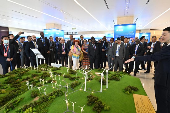 7月6日,駐華使節在國機集團國際化經營成果展廳內參觀由該集團承建的肯尼亞基佩托風電項目沙盤。新華社記者 李鑫 攝