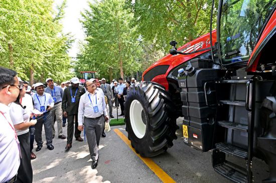 看著現場陳列的一排排大型農機裝備,駐華使節們興致勃勃,紛紛拍照留念,并不時就技術細節、性能參數、應用場景等問題與在場工程技術人員交流。