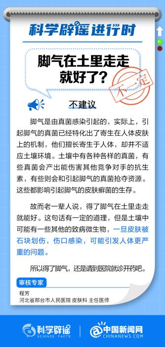 老一輩人說,得了腳氣在土里走走就能好。這句話有一定的道理,但是土壤中可能有一些其他的致病微生物,一旦皮膚被石塊劃傷,傷口感染,可能引發人體更嚴重的問題。所以得了腳氣,還是請到醫院就診開藥吧。(來源:科學辟謠、中國新聞網微博)