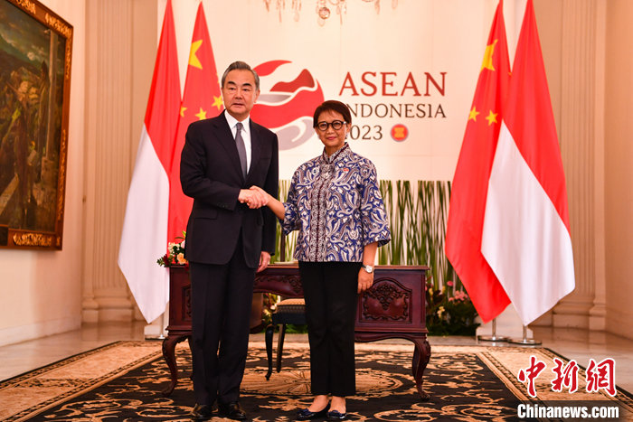 當?shù)貢r間7月12日,中央外辦主任王毅在雅加達會見印尼外長蕾特諾。 中新社發(fā) 徐欽 攝