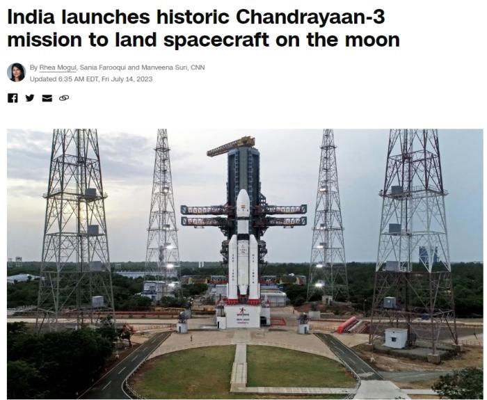 據報道,當地時間約14:35(北京時間約17:05),搭載軌道器、著陸器和月球車的“月船3號”,從印度安得拉邦斯里哈里科塔(Sriharikota)航天中心發射升空。著陸器將于8月23日至24日抵達月球,在月球表面開展14天科學活動。