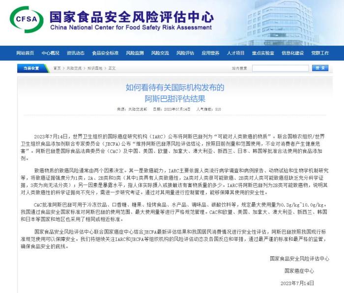 文章稱,國家食品安全風險評估中心聯合國家癌癥中心結合JECFA最新評估結果和我國居民消費情況進行安全性評估,阿斯巴甜按照我國現行標準規范使用可以保障安全。“我們將繼續關注IARC和JECFA等組織機構的風險評估動態及各國反應和舉措,通過最嚴謹的標準和最嚴格的監管,確保食品安全的底線。”(完)