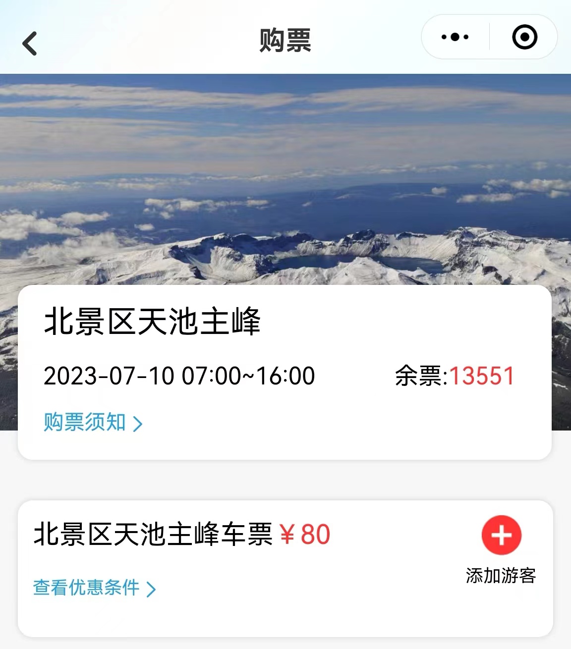 吉林長白山北景區天池主峰車票價格。 截圖自“長白山”微信公眾號。