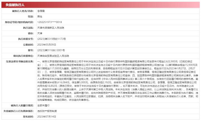 中國執行信息公開網顯示,目前恒信璽利存在多條被執行人信息,恒信璽利和李厚霖也多次收到限制消費令。