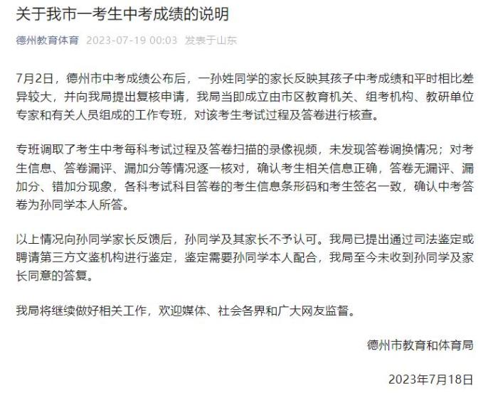 中新網7月19日電 據山東省德州市教育和體育局微信公眾號消息,德州市教育和體育局19日發布說明,7月2日,德州市中考成績公布后,一孫姓同學的家長反映其孩子中考成績和平時相比差異較大,并提出復核申請,德州市教育和體育局當即成立由市區教育機關、組考機構、教研單位專家和有關人員組成的工作專班,對該考生考試過程及答卷進行核查。