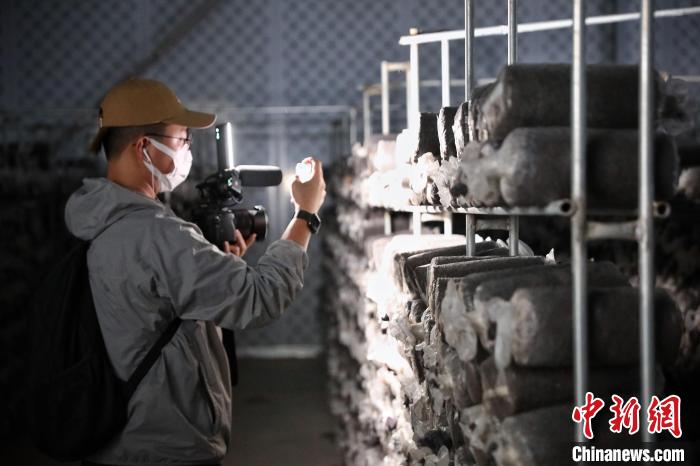 7月17日,甘肅省古浪縣,參加“絲路風采 如意甘肅”聯合采訪活動的兩岸及香港記者在當地養菌出菇的冷庫內采訪拍攝。 中新社記者 李雪峰 攝