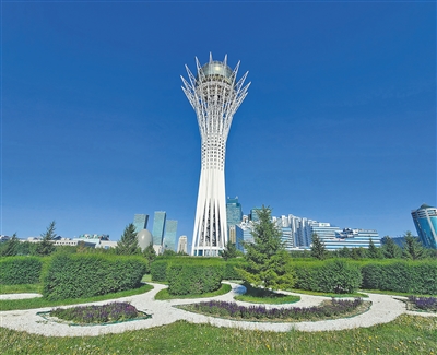 多年來,中國與哈薩克斯坦合作為哈首都阿斯塔納生態圈打造生態屏障。圖為阿斯塔納城市象征——生命之樹,在其觀景平臺上可俯瞰阿斯塔納全景。