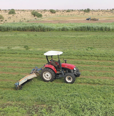 在中國援毛里塔尼亞畜牧業技術示范中心,工作人員操作機械收割紫花苜蓿。