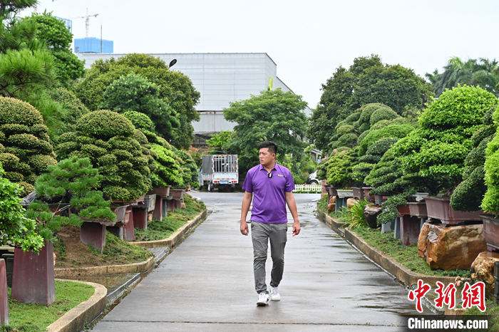 圖為7月18日,廣東佛山,王俞又在嘉盛園藝總場查看盆景長勢。 中新社記者 陳楚紅 攝