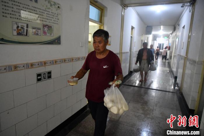 8月1日晚,在涿州市職業(yè)技術(shù)教育中心臨時安置點,民眾剛領(lǐng)取晚飯。 中新社記者 翟羽佳 攝