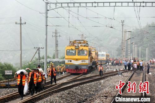 8月1日,北京門頭溝區(qū),豐沙鐵路妙峰山鎮(zhèn)水峪嘴村段,工作人員前往鐵路線清淤搶修。7月29日以來,北京地區(qū)持續(xù)強降雨,西南部降雨量大。受降雨影響,北京豐臺至沙城鐵路(豐沙線)嚴重水害。 中新社記者 盛佳鵬 攝