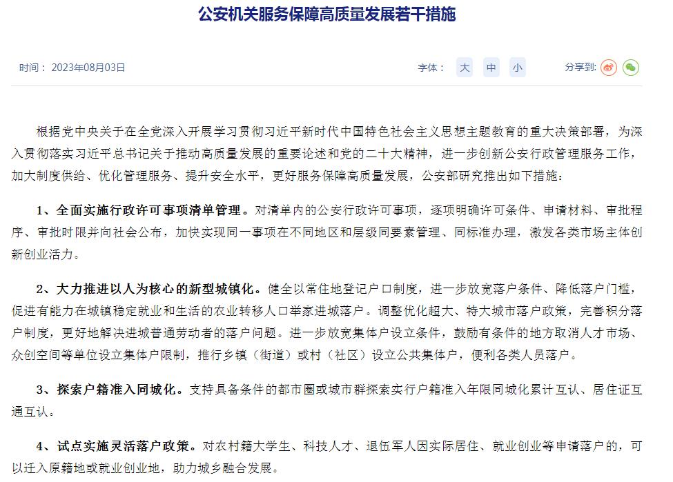 8月3日,公安部發布公安機關服務保障高質量發展若干措施,其中在戶籍政策方面提出一系列舉措。