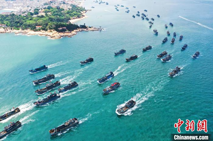 中新網漳州8月16日電(蔡曉曄)16日12時起,北緯26度30分以南的東海結束為期3個半月的伏季休漁期,在福建省漳州市各碼頭,眾多漁船在海警艦艇的護航下有序駛離漁港,千帆競發奔赴不同漁區開展捕撈作業。