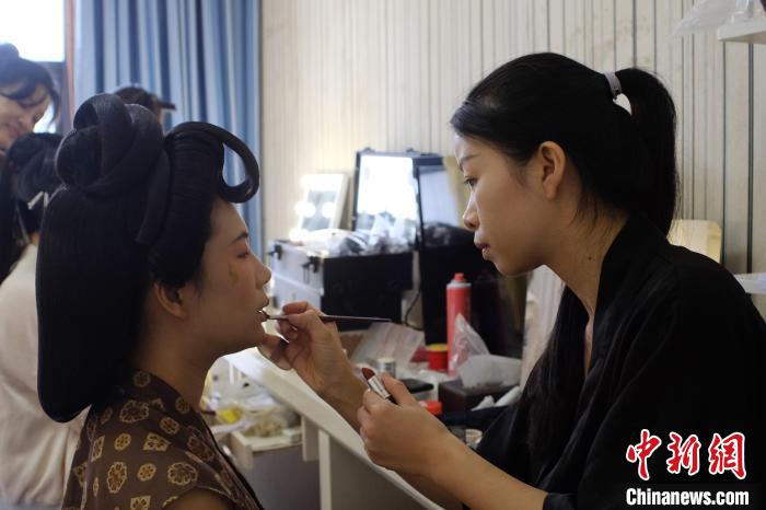 8月20日,廣西柳州,古典妝造師覃麗華正忙著給選手們化妝,完成整套造型需花費數小時。中新社記者 劉俊聰 攝