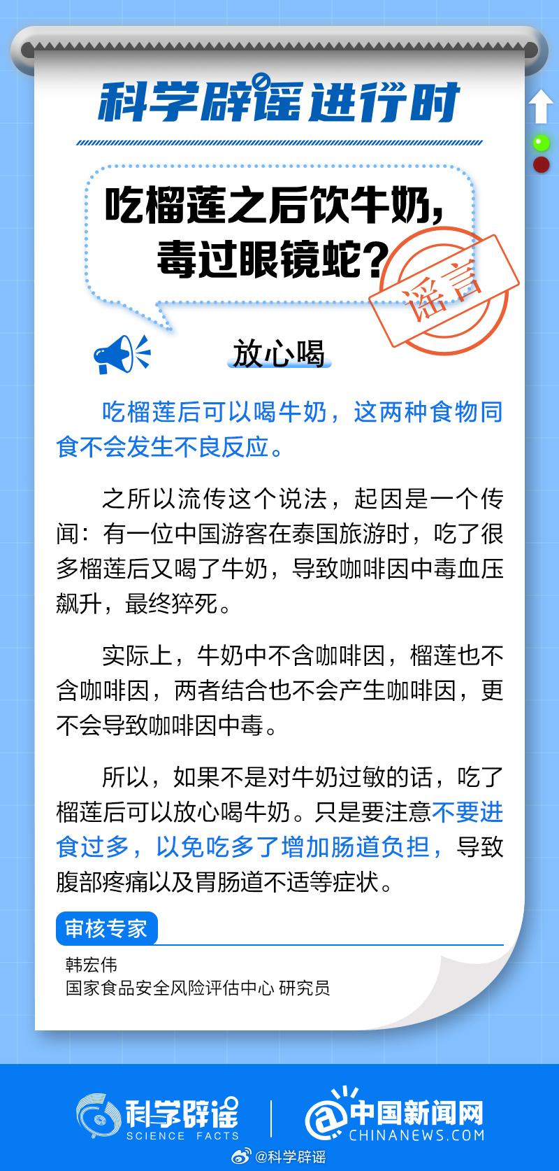 中新網8月24日電 吃榴蓮后可以喝牛奶,這兩種食物同食不會發生不良反應。之所以流傳這個說法,起因是一個傳聞:有一位中國游客在泰國旅游時,吃了很多榴蓮后又喝了牛奶,導致咖啡因中毒血壓飆升,最終猝死。實際上,牛奶中不含咖啡因,榴蓮也不含咖啡因,兩者結合也不會產生咖啡因,更不會導致咖啡因中毒。(來源:@科學辟謠 @中國新聞網 )