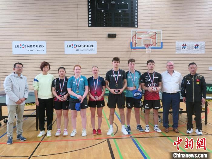 中國駐盧森堡大使華寧(左一)、奧運冠軍張怡寧(左二)、閻森(右一)等與參加青年集訓營的選手合影留念。中新網發 中國駐盧森堡使館供圖