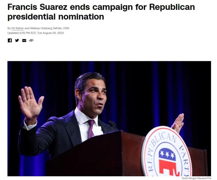中新網8月30日電 綜合外媒報道,當地時間29日,美國邁阿密市長弗朗西斯·蘇亞雷斯(Francis Suarez)宣布暫停其2024年美國總統競選活動。美聯社指出,蘇亞雷斯由此成為第一位宣布退出共和黨黨內初選的參選人。