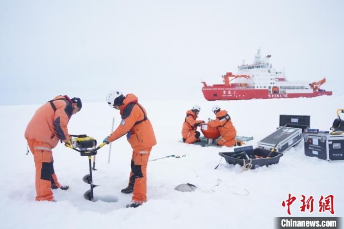近日,中國第13次北冰洋科學(xué)考察隊(duì)在北極點(diǎn)附近開展海冰綜合作業(yè)。(自然資源部供圖)