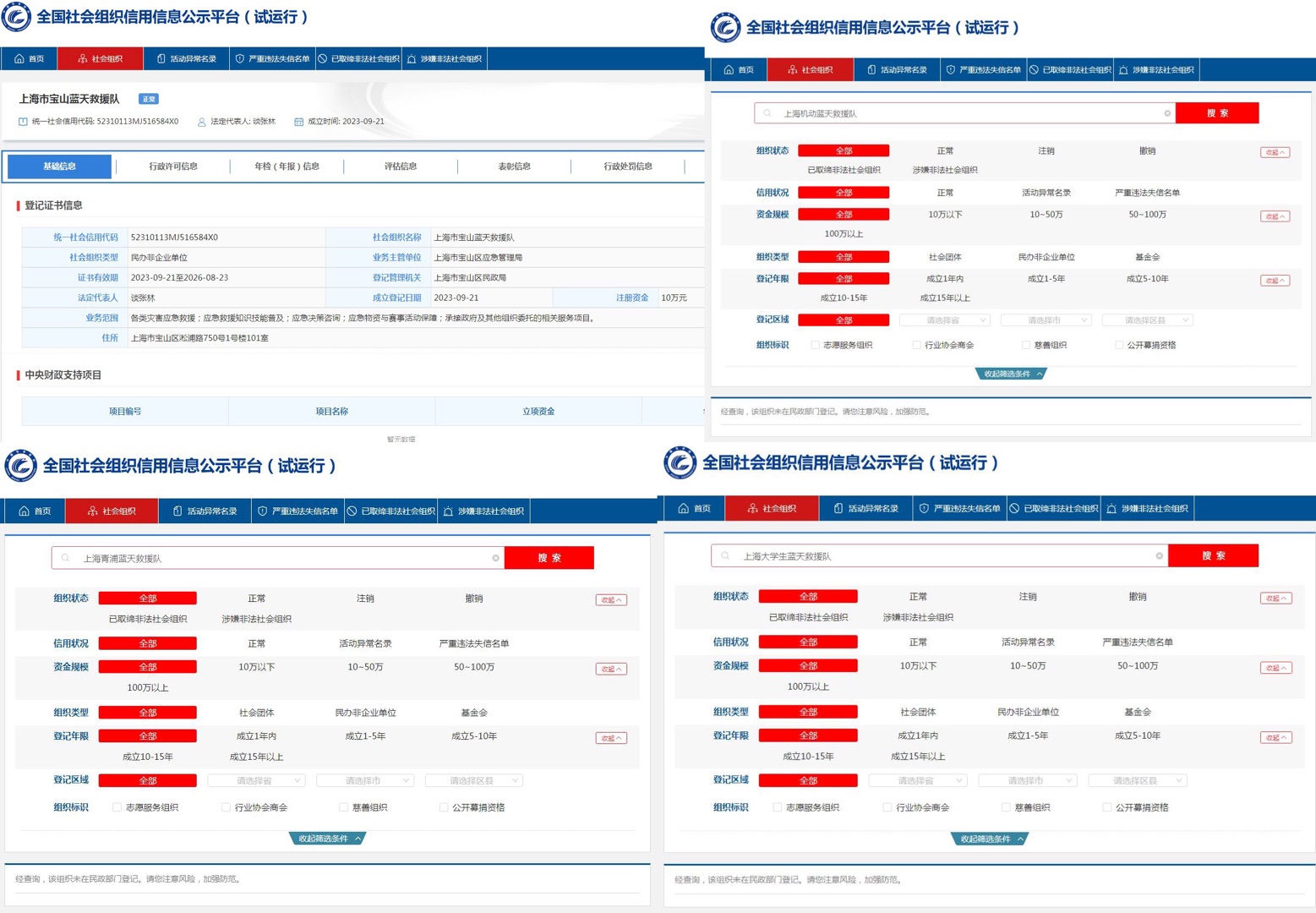 中新網(wǎng)查詢?nèi)珖鐣?huì)組織信用信息公示平臺(tái)發(fā)現(xiàn),上海市寶山藍(lán)天救援隊(duì)成立登記日期為2023年9月21日,系民辦非企業(yè)單位,業(yè)務(wù)主管單位為上海市寶山區(qū)應(yīng)急管理局。其余3個(gè)組織顯示為“該組織未在民政部門登記,請(qǐng)您注意風(fēng)險(xiǎn),加強(qiáng)防范”。