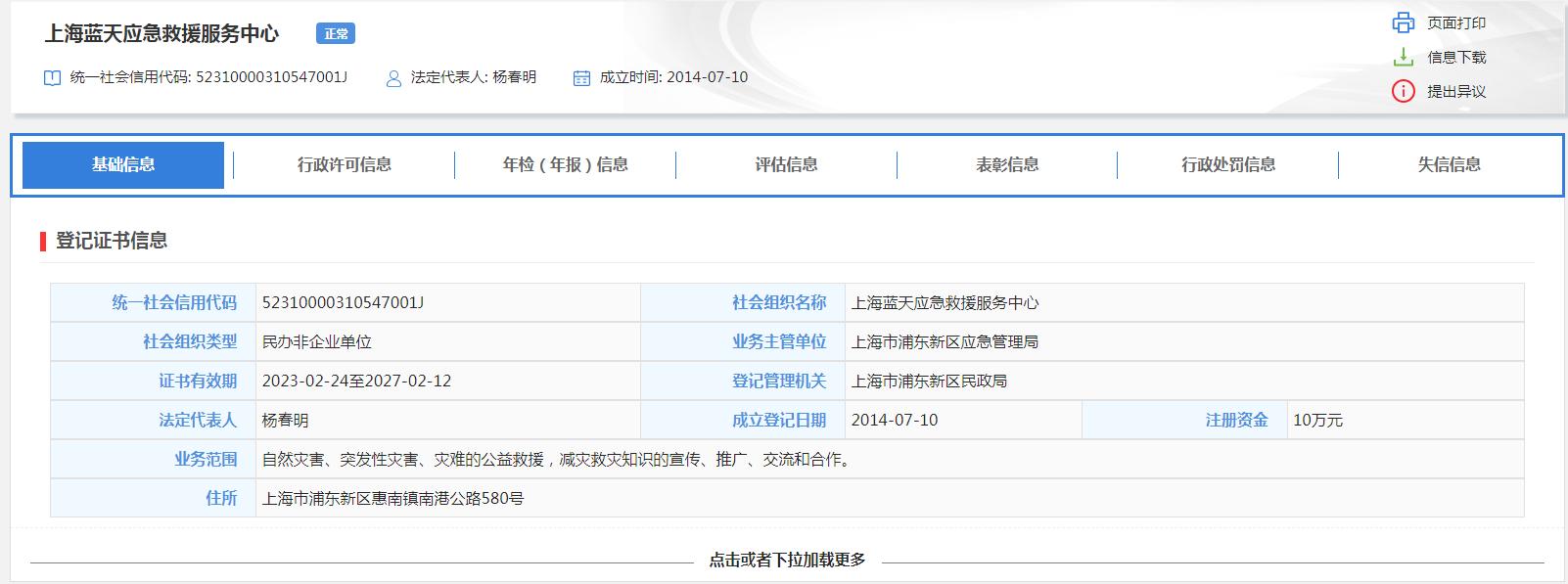 企查查信息顯示,上海藍(lán)天應(yīng)急救援服務(wù)中心成立于2014年,法人為楊春明。全國社會(huì)組織信用信息公示平臺(tái)顯示,其成立登記日期為2014年7月10日,系民辦非企業(yè)單位,登記管理機(jī)關(guān)為上海市浦東新區(qū)民政局。