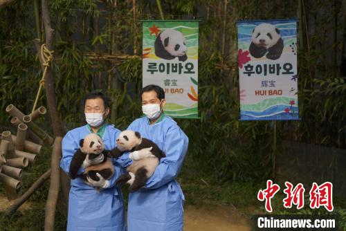 旅韓大熊貓“愛(ài)寶”“樂(lè)寶”的雙胞胎雌性幼崽即將出生滿百日。12日上午,位于韓國(guó)京畿道龍仁市的愛(ài)寶樂(lè)園熊貓館舉行雙胞胎幼崽首次公眾見(jiàn)面會(huì),并公布了它們的名字為“睿寶”和“輝寶”。