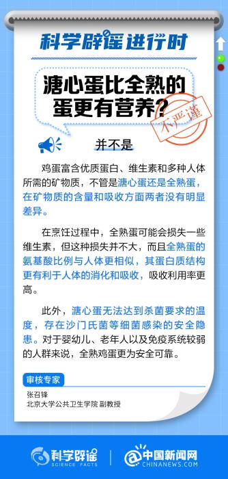 中新網(wǎng)10月20日電 溏心蛋和全熟蛋在礦物質(zhì)的含量和吸收方面沒(méi)有明顯差異。在烹飪過(guò)程中,全熟蛋可能會(huì)損失一些維生素,但這種損失并不大,而且全熟蛋的氨基酸比例與人體更相似,其蛋白質(zhì)結(jié)構(gòu)更有利于人體的消化和吸收。此外,溏心蛋無(wú)法達(dá)到殺菌要求的溫度,存在沙門(mén)氏菌等細(xì)菌感染的安全隱患。(來(lái)源:@科學(xué)辟謠 @中國(guó)新聞網(wǎng) )