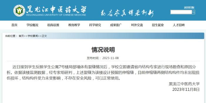 中新網11月9日電 據黑龍江中醫藥大學網站消息,近日,黑龍江中醫藥大學接到學生反映學生公寓7號樓局部墻體有裂縫情況后,學校立即邀請省內結構專家進行現場勘查和原因分析。依據該樓監測數據,經專家組研判,上述裂縫為該樓設計預留的伸縮縫,目前伸縮縫兩側結構構件均未出現損傷損壞,結構構件受力未受影響,不存在安全風險,可以正常使用。
