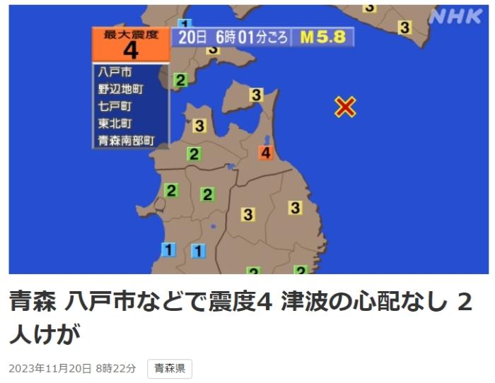 中新網11月20日電 據日本放送協會(NHK)報道,當地時間20日6時,日本青森縣近海發生5.8級地震,震源深度50千米。