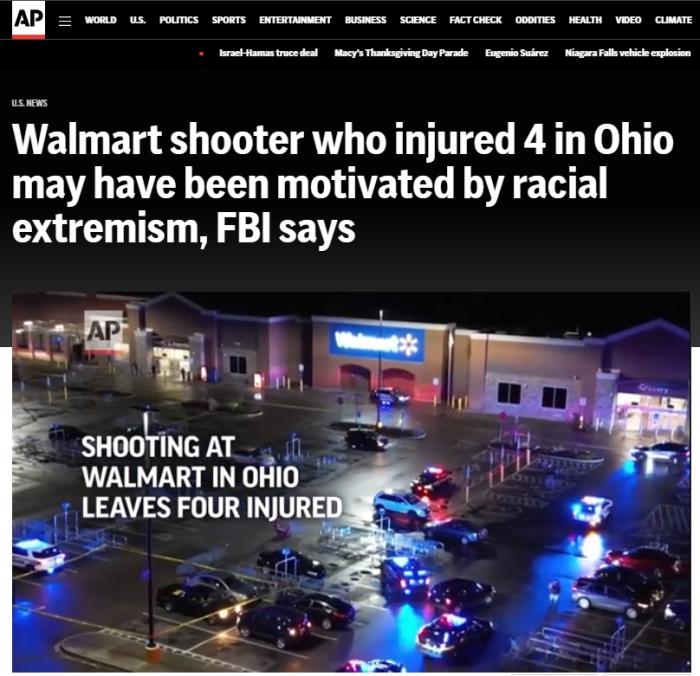 FBI稱,當(dāng)?shù)貢r間20日晚上,美國俄亥俄州代頓市郊區(qū)的一家沃爾瑪發(fā)生槍擊事件,四名購物者受傷,包括兩名黑人女性、一名白人女性和一名白人男性。