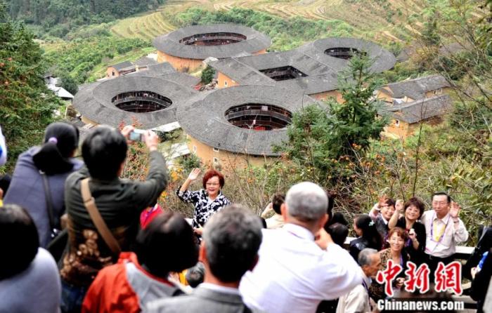 2011年,來自世界五大洲三十多個國家和地區(qū)的海內(nèi)外華人作家、學(xué)者,參加完在廣州舉辦的世界華文文學(xué)研討會后,來到福建漳州,參觀南靖土樓群。王東明 攝