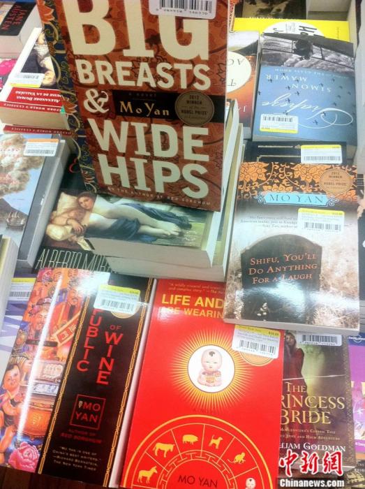 2012年10月21日,莫言的《豐乳肥臀》《酒國》等多部作品英文版正在紐約一家書店上架出售,每本書的封面都印有“2012年諾貝爾文學(xué)獎獲得者”字樣。李洋 攝